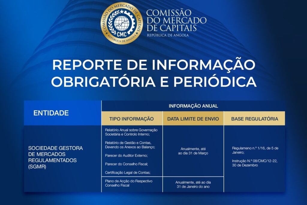 A Comissão do Mercado de Capitais (CMC) recordou às Sociedades Gestoras de Mercados Regulamentados (SGMR) a obrigatoriedade de submissão da Informação Anual dentro dos prazos legalmente estabelecidos, sublinhando que o cumprimento rigoroso destas obrigações constitui um pilar essencial da transparência e da confiança no mercado de capitais.
